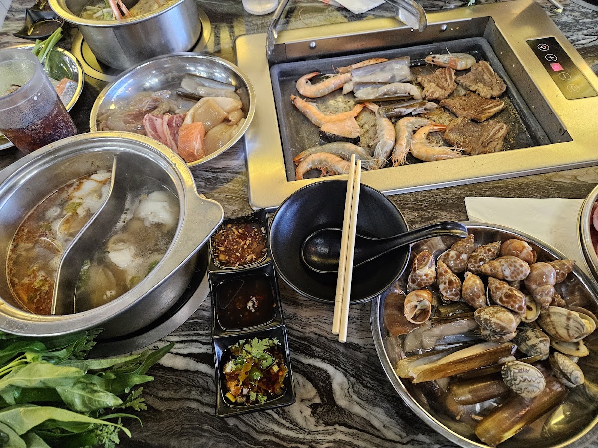 Their broths for the hot pot are very tasty one is Phò and the other is something sour which is good to make sinigang. There are a lot of selection of seafood and meats for both soups and also for grilling. Vegetables abd a wide variety of wondeful sauces are also included in the all-you-can-get counter. They have fresh seafood bar, fresh marinated and unmarinated meat bar, cooked seafood/shelfish bar, vegetable bar and sauces bar. They also have a few dessert available and very refreshing drinks you can order. Customer service is on point. The owner and the staff were very nice and accommodating. The only thing is, it was very hot when we went there and unfortunately got a table near their open door. So the enjoyment of the hot soup was a bit minimized because we were profusely sweating while eating. Nevertheless we still enjoyed the food.
